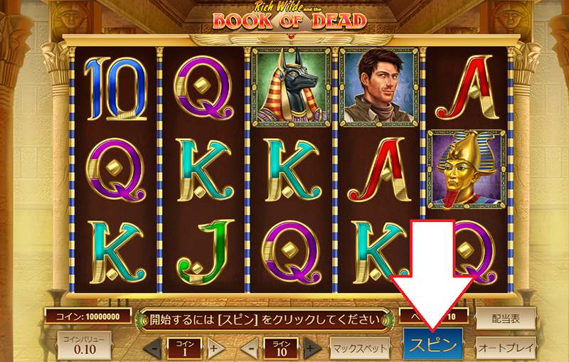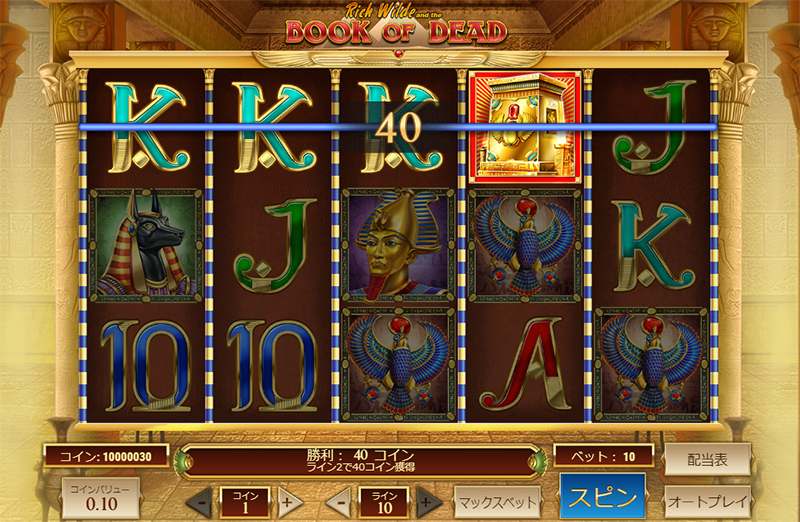 「ブックオブデッド (Book of Dead)」スロットは還元率が96.21%で、小役が成立した時に「ギャンブル」機能で配当を最大に4倍にまで増やせるのが特徴のスロットです。フリースピンを獲得してボーナスモードになれば、追加のフリースピン獲得で高配当が狙います。
