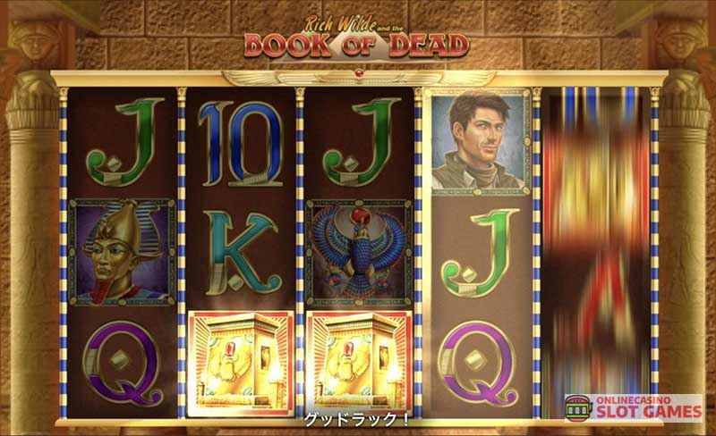 ブックオブデッドはワイルドシンボルがスキャッターシンボルも兼ねています。そしてどのリールでもよいのでスキャッターシンボル(ワイルドシンボル)が2個出現すればリーチとなり、残りのリールが回転し、1本ずつ停止していきます。