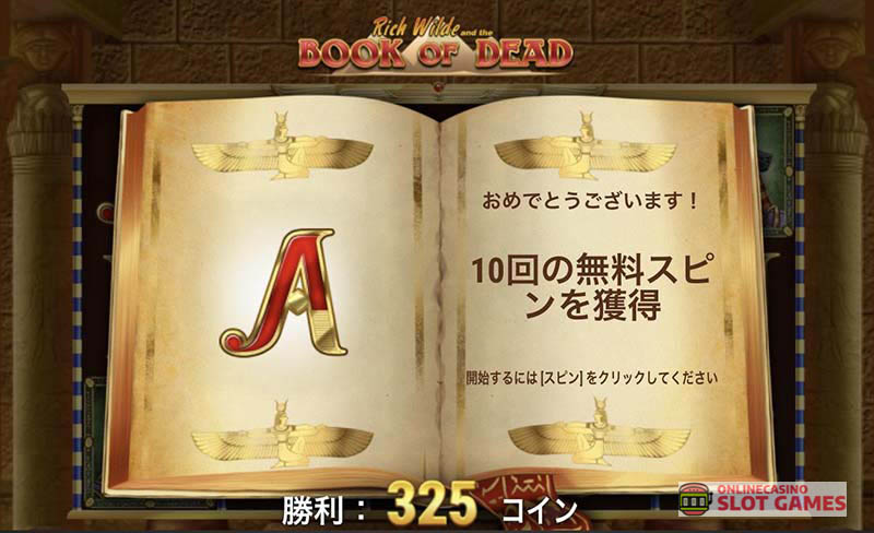 ブックオブデッドはスキャッターシンボルが3つ以上出現すればフリースピン10回を獲得しボーナスゲームに移行します。