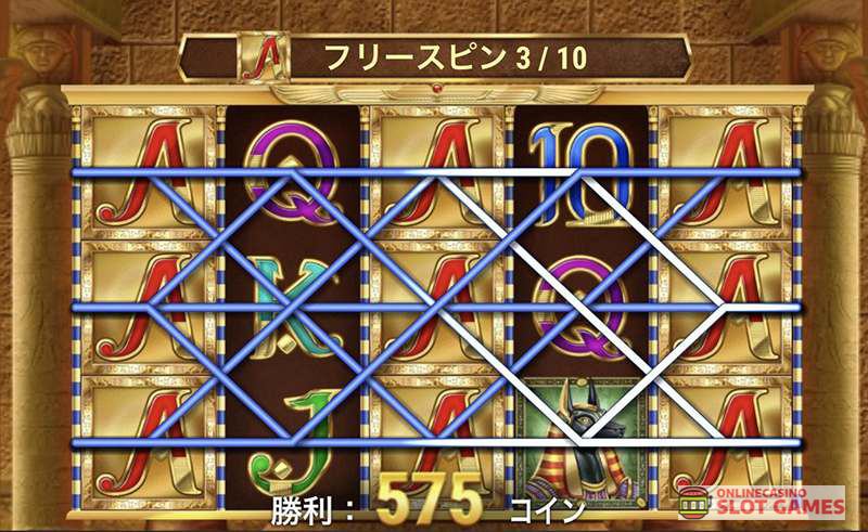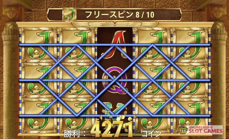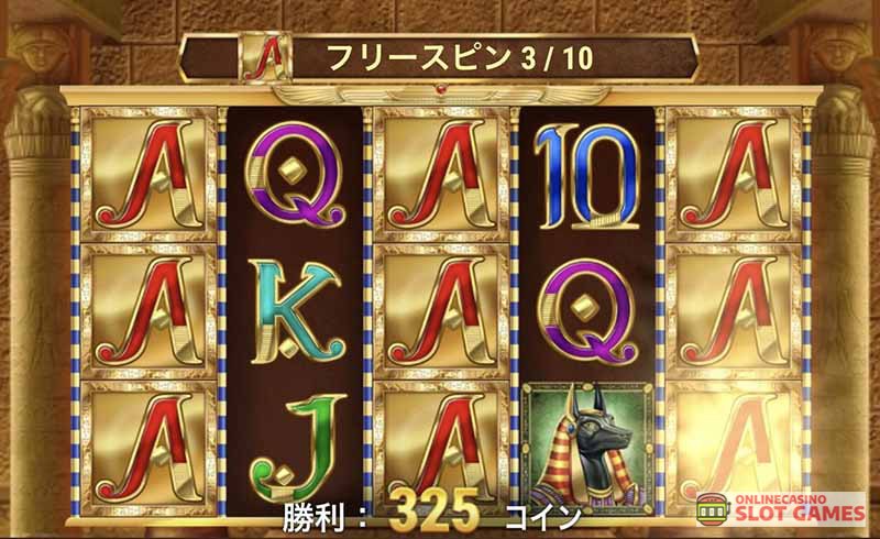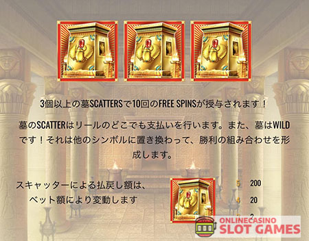 またワイルドシンボルはスキャッターシンボルのかわりにもなり、どの位置にでもスキャッターシンボル(ワイルドシンボル)が3個以上出現するとフリースピンを10回獲得してボーナスゲームに移行します。
