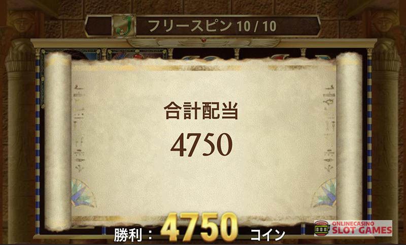 これは追加のフリースピンを獲得していない例ですが、コインバリューが0.02ドルなので「4750×0.02=95(ドル)」と、賭け金1ドルの95倍の配当を獲得しています。
