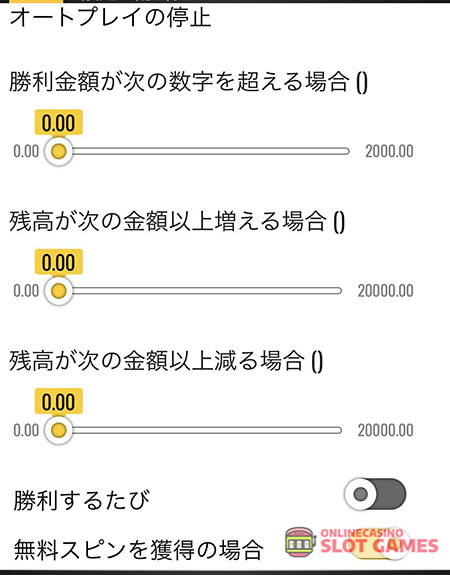 ただし連続スピンにしていると、このギャンブル機能は使えません。配当を増やすチャンスを得るためには連続スピンの停止条件で「勝利するたび」にチェックを入れておきましょう。